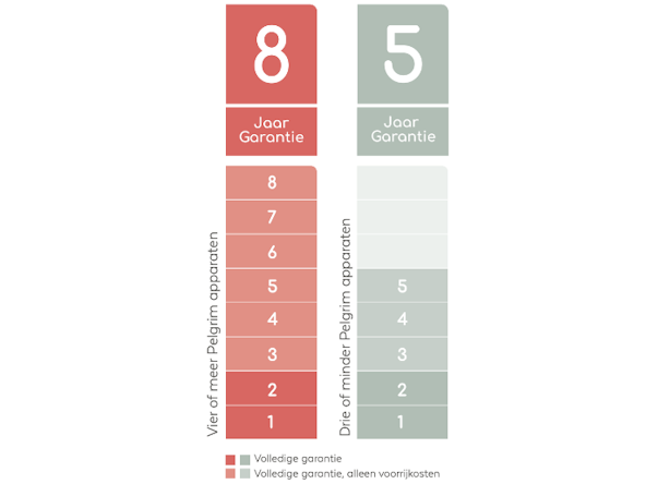 Wanneer u in één koop tot en met drie (of minder) Pelgrim inbouw- en/of vrijstaande apparaten aankoopt, ontvangt u na registratie vijf jaar garantie*, waarvan twee jaar volledige fabrieksgarantie. Voor de resterende drie jaar betaalt u slechts de voorrijkosten.